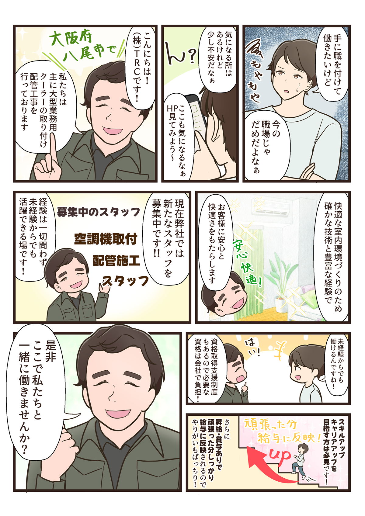 株式会社TRCは大阪府八尾市に拠点に店舗、オフィス、工場、公共施設など、多種多様な建築物における空調設備工事を承っております。